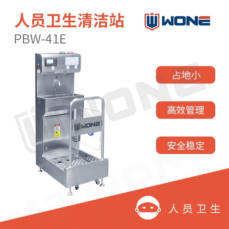 联合食安人员卫生清洁站-PBW-41E,占地小,集洗手、手烘干、手消毒、鞋靴消毒四种功能。